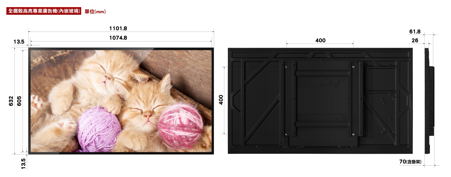 1077.2(H) x 607.4(V) mm(無玻璃款式) 1074.8(H) x 605(V) mm(內嵌玻璃款式) |